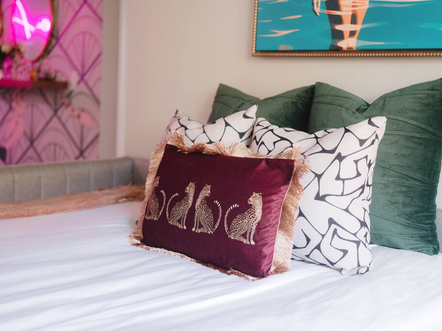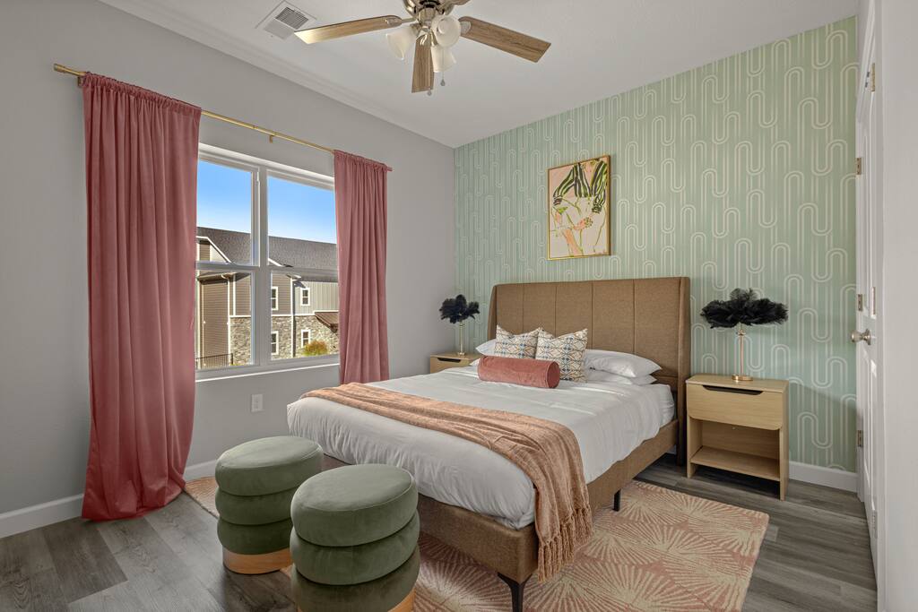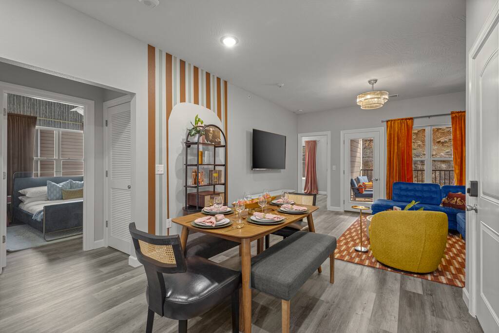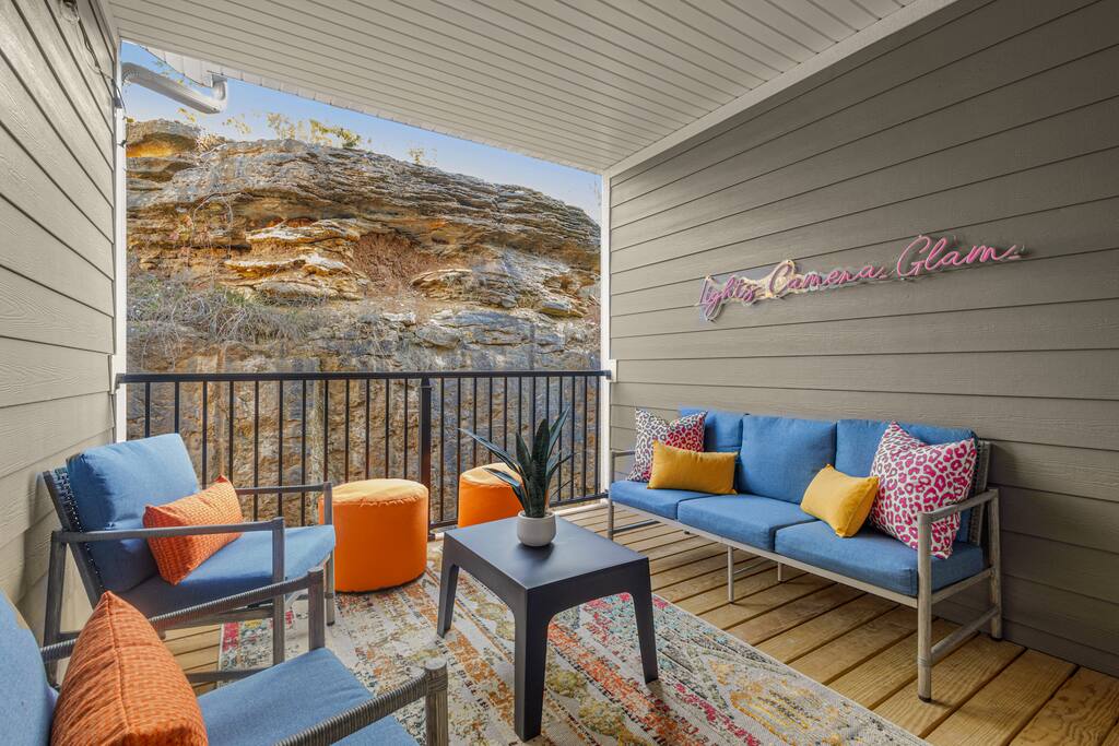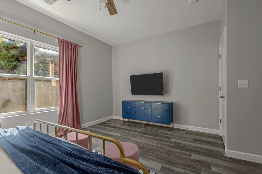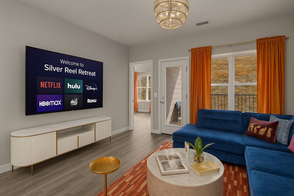 Silver Reel Retreat: Old Hollywood Glam + Movie Room. Live like a star at this new chic Old Hollywood-themed 4-bedroom, 3-bath retreat, featuring a private movie room and a balcony with stunning rock formation views. Enjoy vintage décor, glamorous details, and plush comfort throughout. Each room has a TV, and the fully equipped kitchen is perfect for cooking and entertaining. Relax by the community pool & BBQ. Idea families, or groups seeking a stylish, nostalgic escape with modern conveniences.